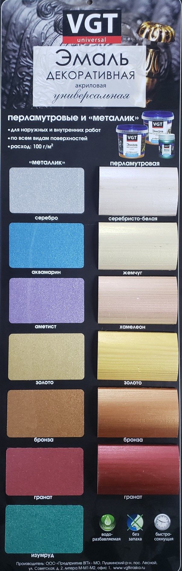 Эмаль акриловая ВД-АК-1179 Металлик VGT-ecology material - Эмаль универсальная «Металлик» для декоративной окраски различных поверхностей.Обладает натуральным металлическим блеском, высокой свето-, водо- и атмосферостойкостью