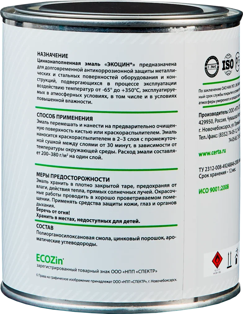 Эмаль цинконаполненная Экоцин Церта - Специальная цинконаполненная эмаль с высокой коррозионной стойкостью