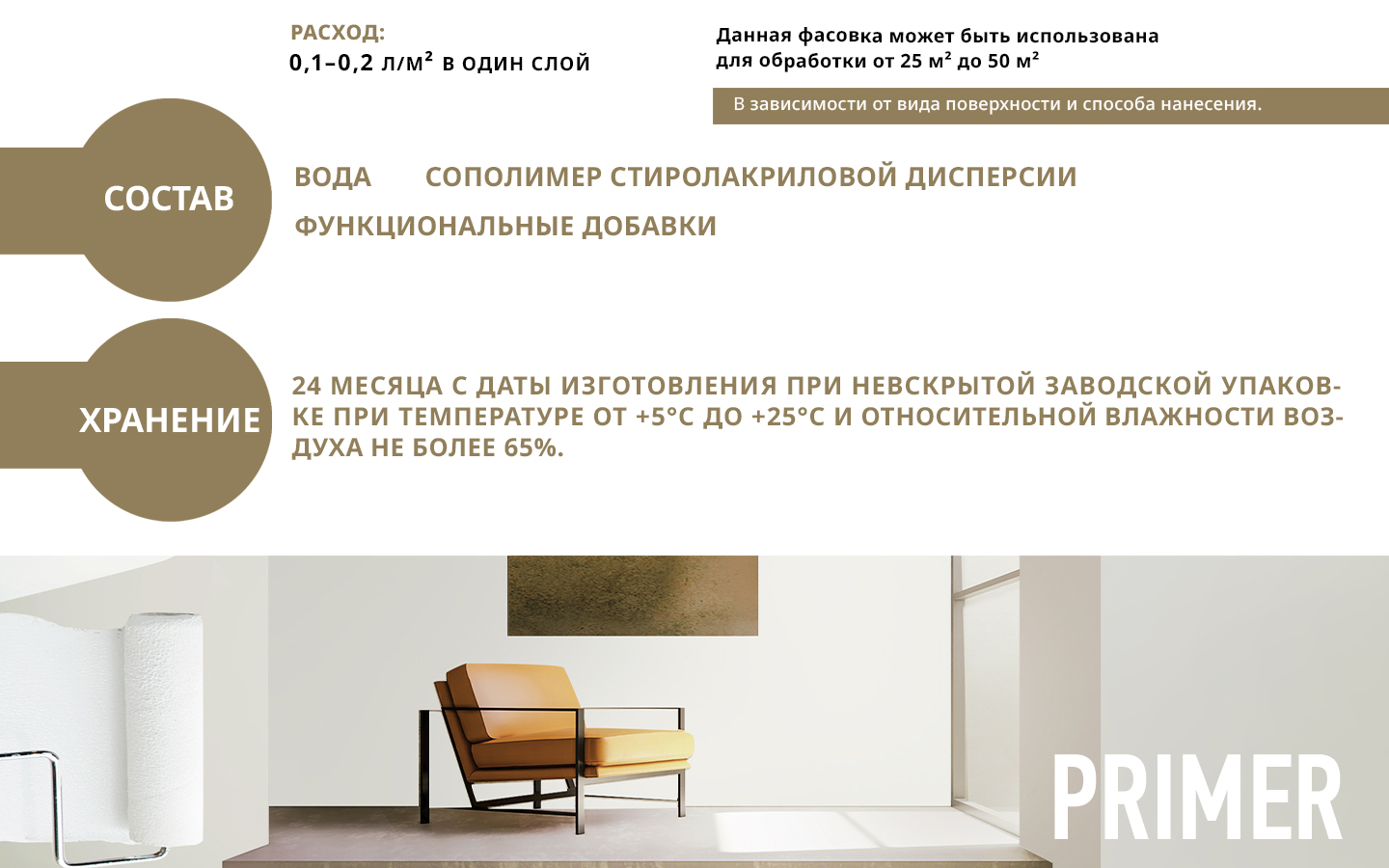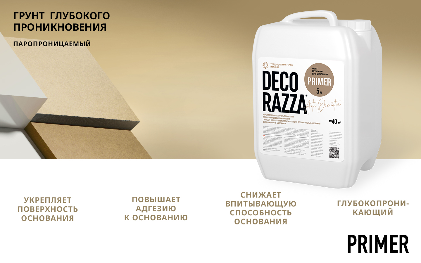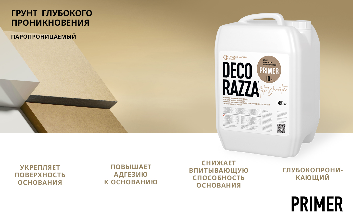 Грунт глубокого проникновения PRIMER Decorazza - Грунт Decorazza PRIMER — это высококачественная акриловая грунтовка, специально разработанное для минеральных поверхностей, таких как бетон, кирпич и штукатурка. Этот грунт обладает уникальной способностью глубокого проникновения, что обеспечивает прочное и долговечное сцепление с основанием, обеспечивая идеальную основу под последующие отделочные работы.