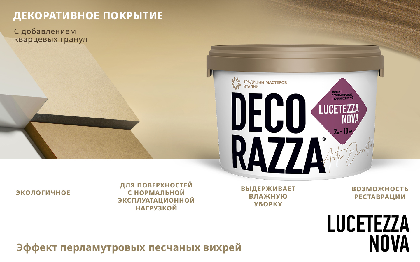 Декоративная краска Lucetezza с перламутром и кварцевыми частицами позволяет создавать запоминающиеся эффекты с переливами и переходами цвета, в том числе роскошный «Клондайк NERO» и брутальный декор «Сварные швы». Материал выпускается в 5 базах: серебро, золото, алюминий, бронза, медь, может колероваться в спокойные пастельные и яркие оттенки. Формируемое покрытие с легкой песчаной структурой устойчиво к влажной уборке, экологично, изысканно смотрится в классических и современных интерьерах фотостудий, гостиных, спален, прихожих, столовых в загородных домах, кабинетов и конференц-залов в офисах и на других объектах. Средний расход не превышает 0,2 л/м2.