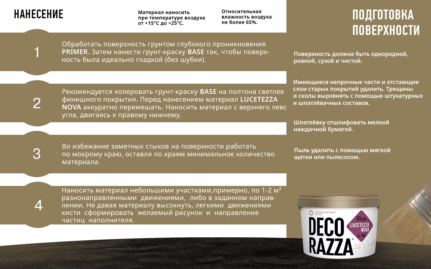При температуре окружающей среды +22°С и относительной влажности не более 65 %: Грунт глубокого проникновения Primer 2-3 часа. Грунт-краска Base 6-12 часов. Декоративное покрытие Lucetezza : полное высыхание через 24 часа влажная уборка не ранее, чем через 28 дней. Время высыхания материалов может меняться в зависимости от температуры и влажности окружающей среды. |