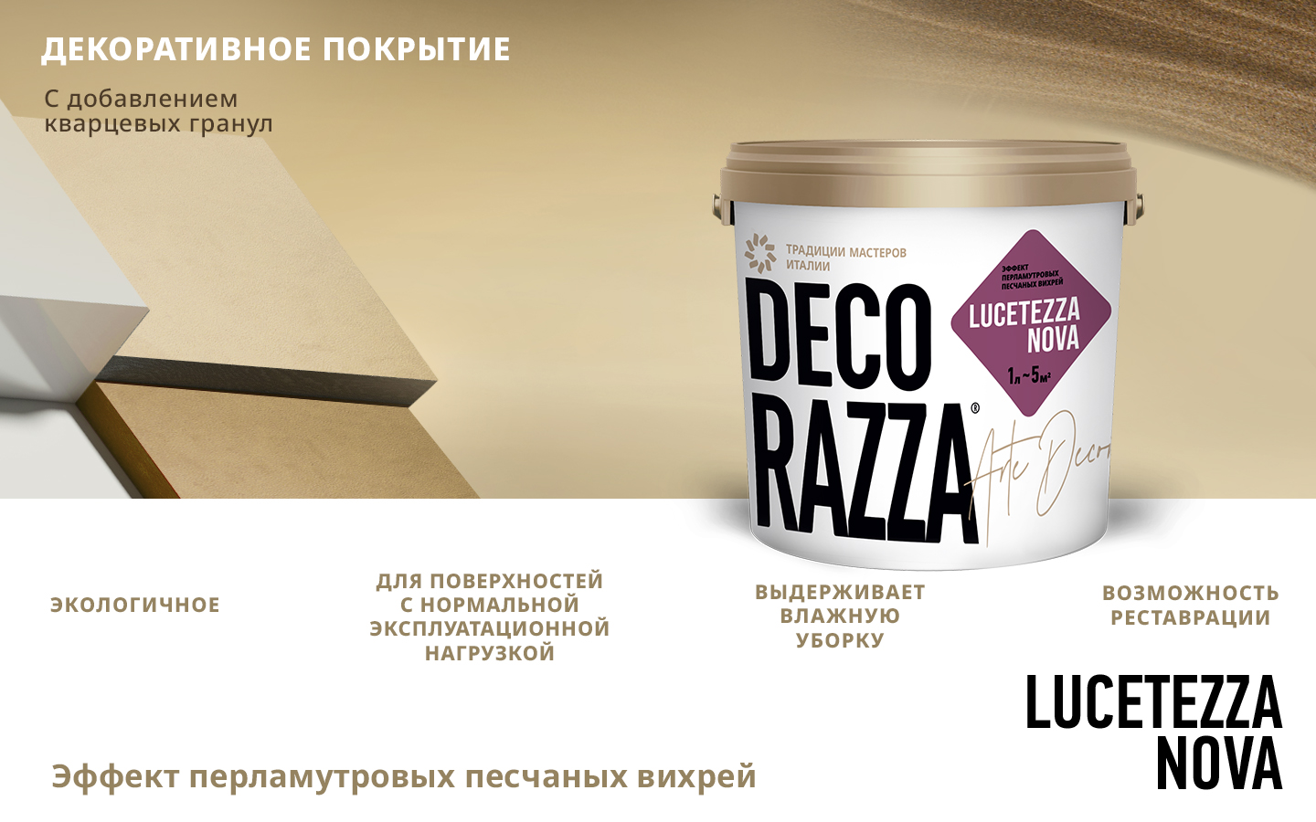 Декоративная краска Lucetezza с перламутром и кварцевыми частицами позволяет создавать запоминающиеся эффекты с переливами и переходами цвета, в том числе роскошный «Клондайк NERO» и брутальный декор «Сварные швы». Материал выпускается в 5 базах: серебро, золото, алюминий, бронза, медь, может колероваться в спокойные пастельные и яркие оттенки. Формируемое покрытие с легкой песчаной структурой устойчиво к влажной уборке, экологично, изысканно смотрится в классических и современных интерьерах фотостудий, гостиных, спален, прихожих, столовых в загородных домах, кабинетов и конференц-залов в офисах и на других объектах. Средний расход не превышает 0,2 л/м2.