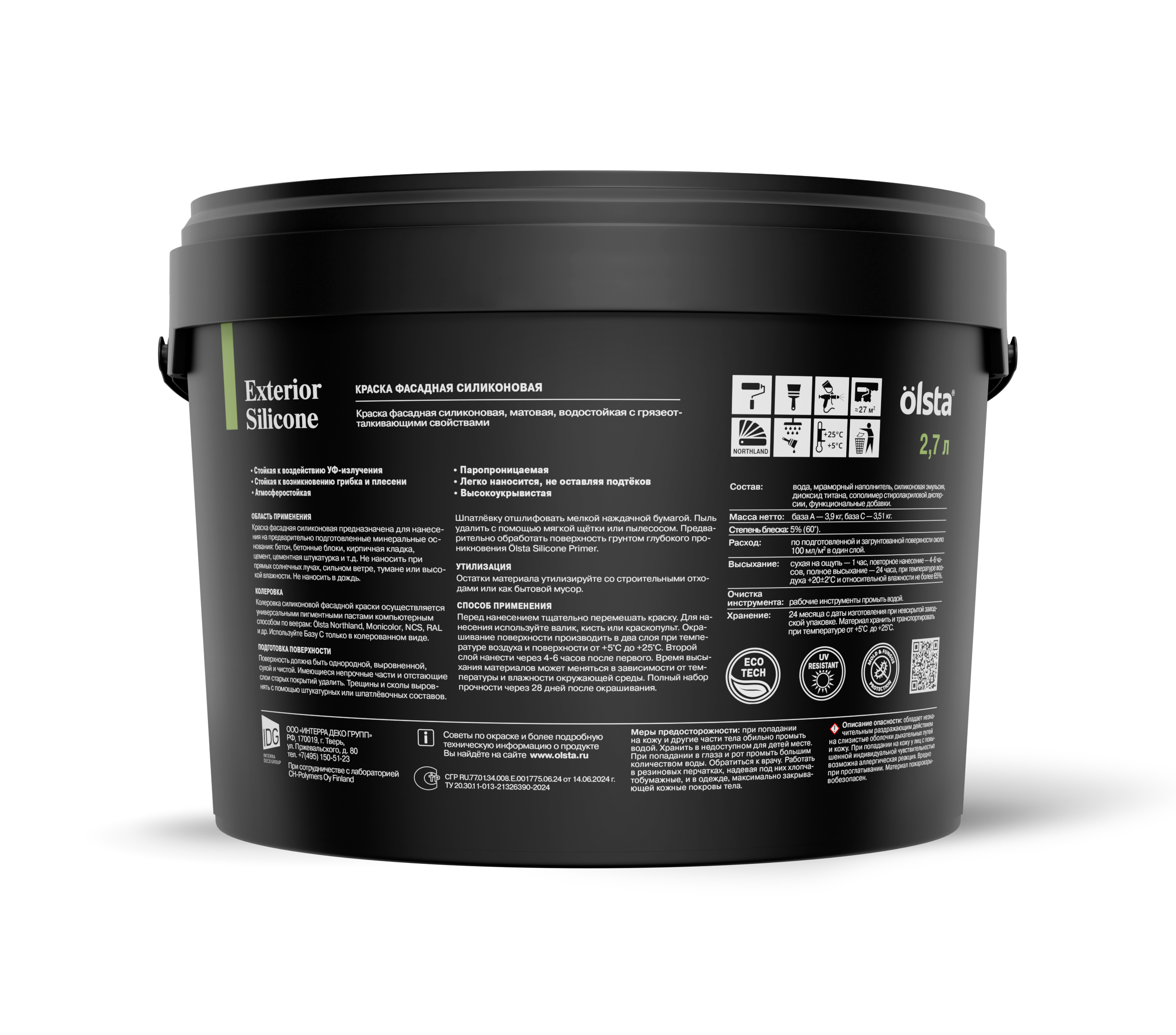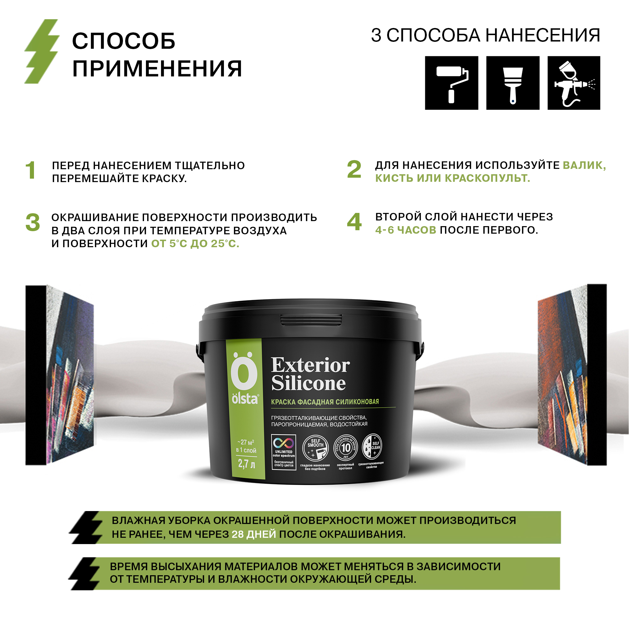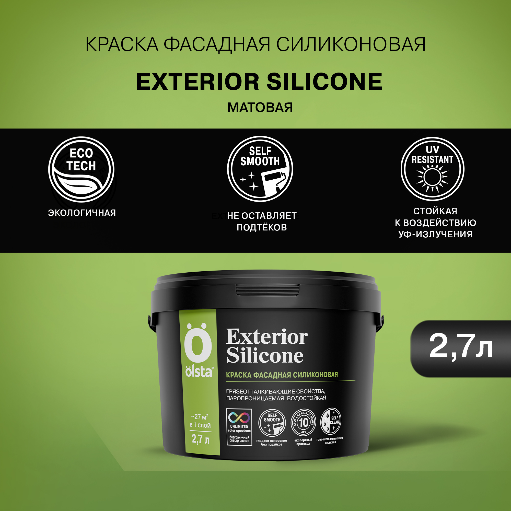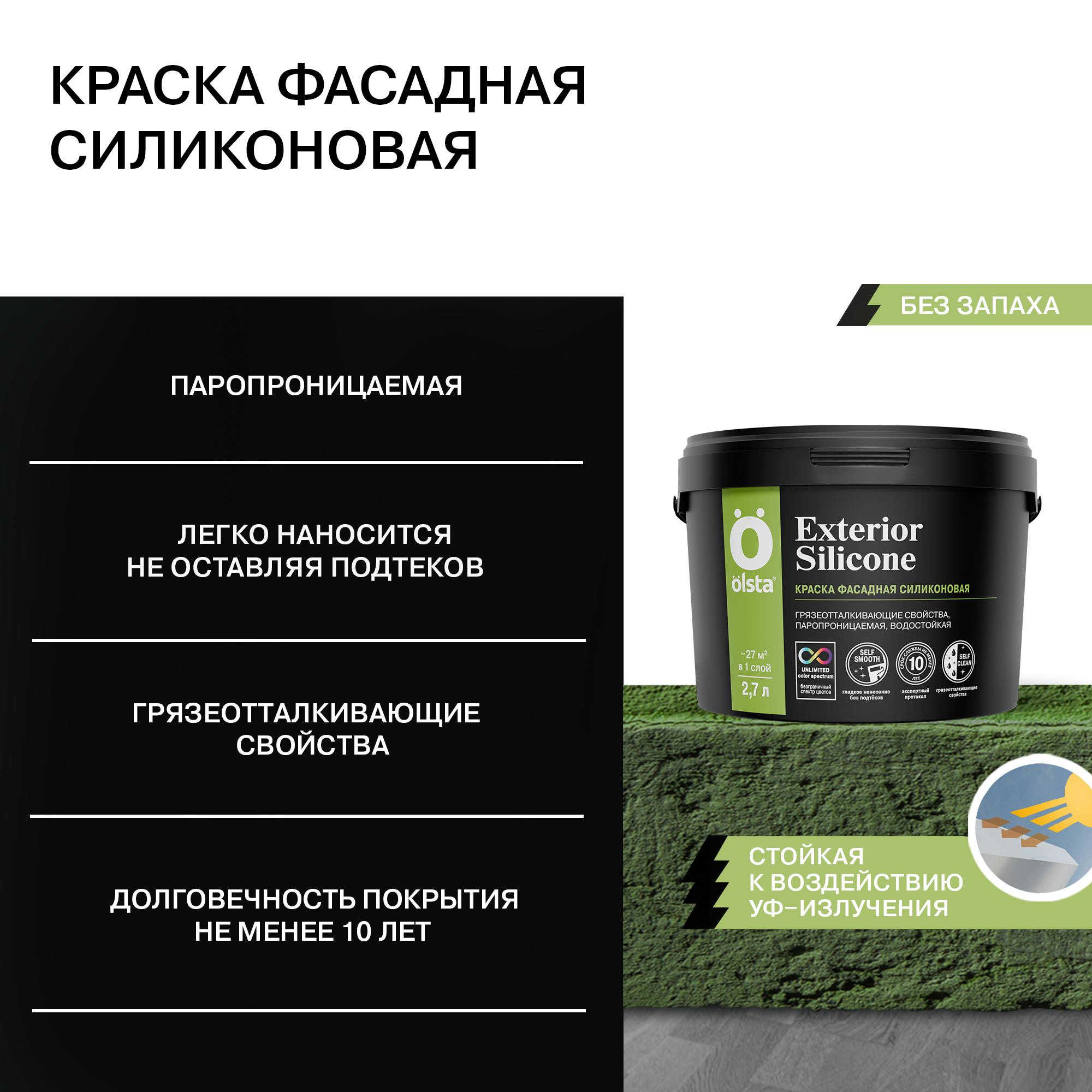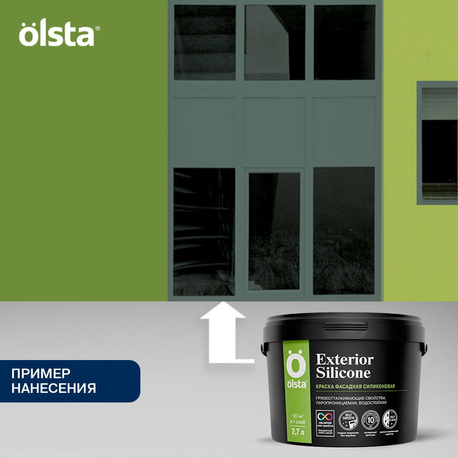 OLSTA EXTERIOR SILICONE отличается высокой атмосферостойкостью, обеспечивая защиту от воздействия дождя, снега, солнца и перепадов температур. Её паропроницаемость гарантирует долговечность покрытия, предотвращая накопление влаги внутри стен. Краска абсолютно без запаха, что делает процесс её нанесения комфортным и безопасным для здоровья.