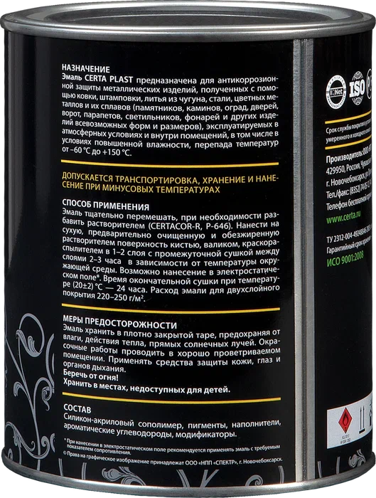Формула CERTA на кремнийорганической основе защищает от коррозии, придает отличное сцепление с окрашиваемой поверхностью, возможность всесезонного нанесения в диапазоне −5...+30 °С. Высыхает на «отлип» за 30 минут при +20 °С.