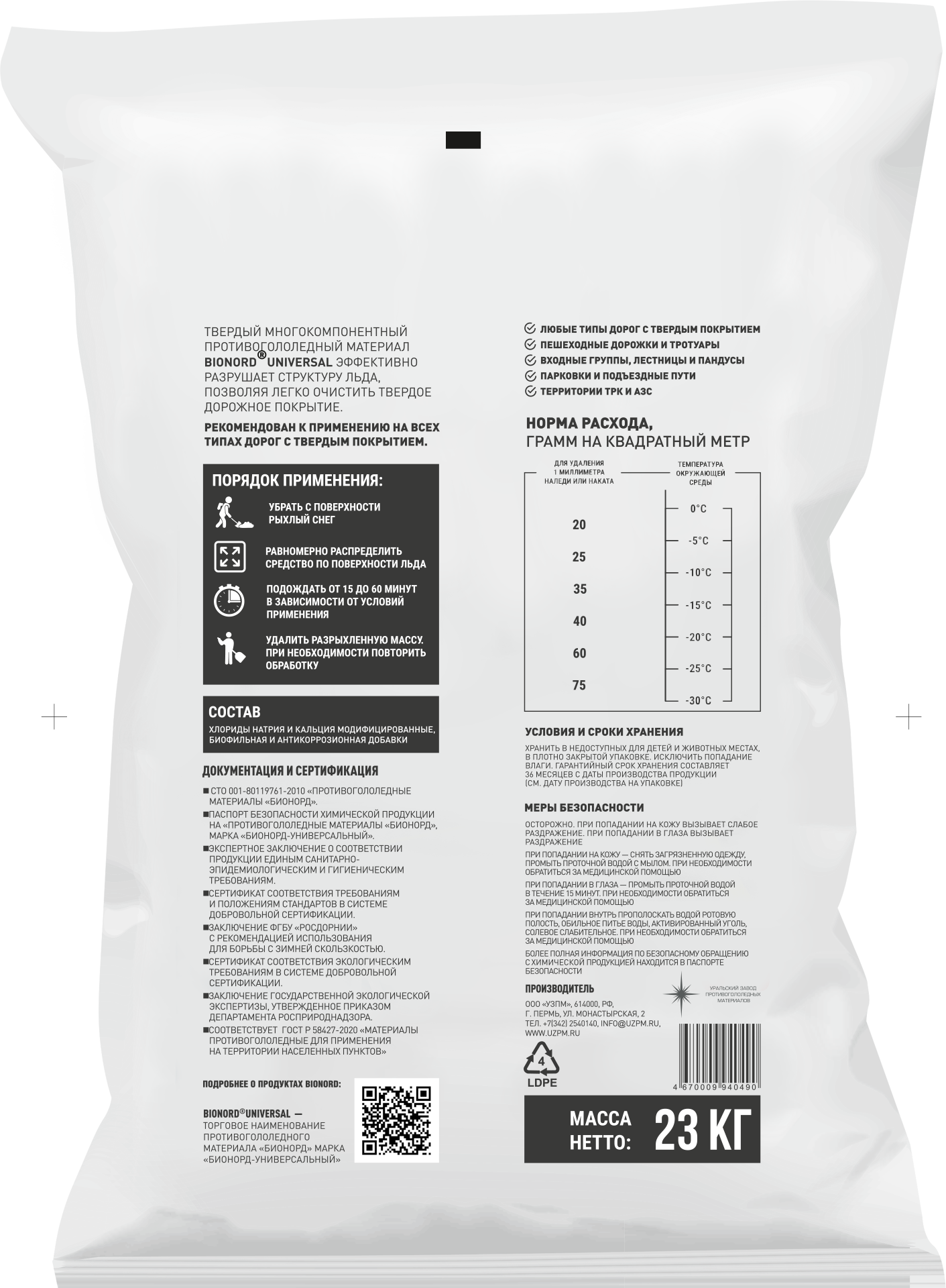 Универсальный противогололедный материал, предназначенный для использования на твердых покрытиях любого типа из асфальта, камня, бетона и плитки. Производство BIONORD UNIVERSAL осуществляется по передовой технологии ЕДИНАЯ ГРАНУЛА. Материал оказывает минимальное воздействие на почву, на изделия из кожи и лапы животных, металлические конструкции за счет введения в состав биофильных добавок и антикоррозионных компонентов. Экологичность BIONORD подтверждается Положительным заключением Государственной экологической экспертизы. Поставляется в полиэтиленовом мешке 12 и 23 кг, а также МКР 800 кг.
